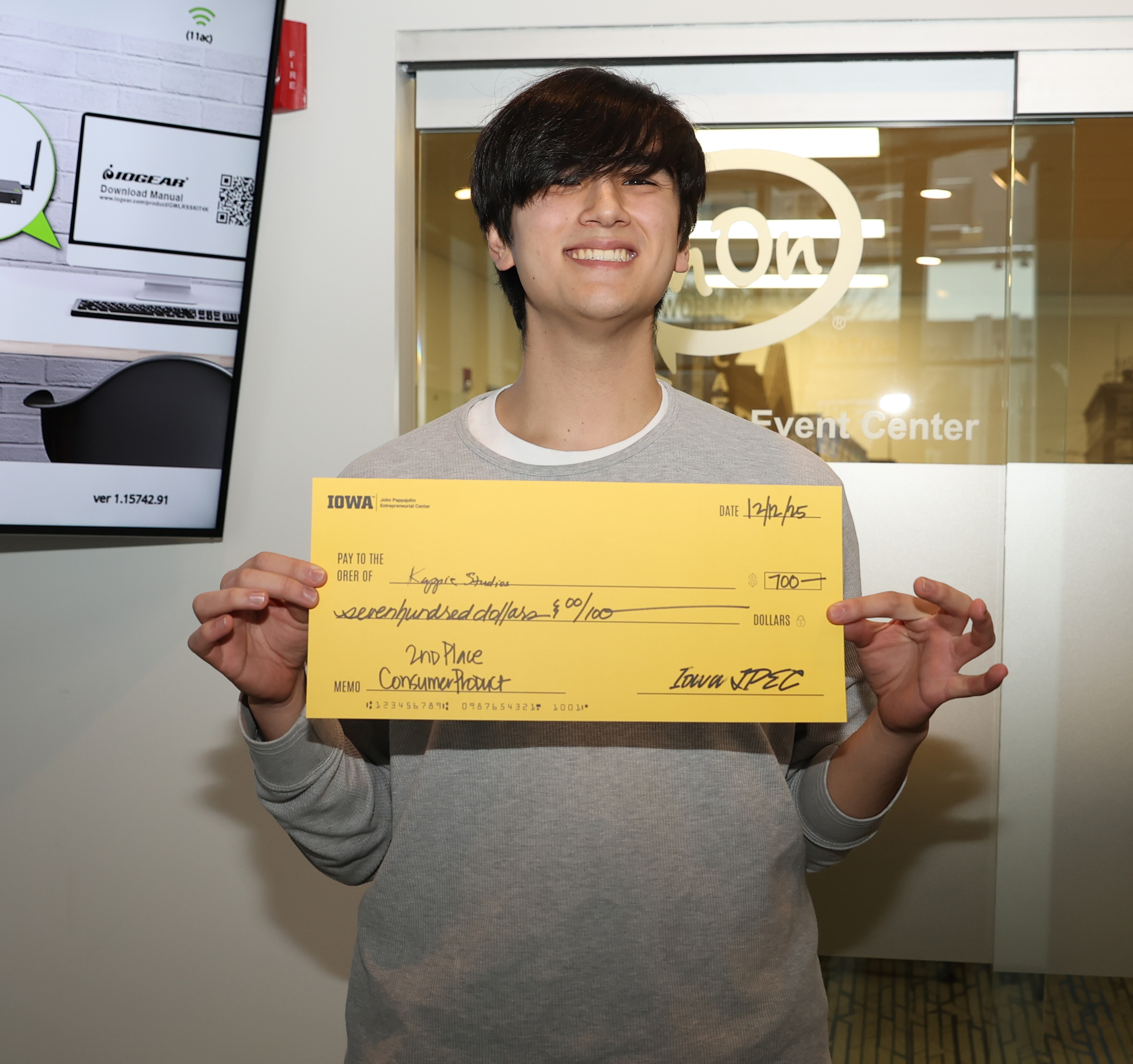 The runners-up in each category received $700 apiece — Daniel Mendez and Easy-org (Tech/Student Lifestyle) and Leo Myers and Kappie Studios (Consumer Product).